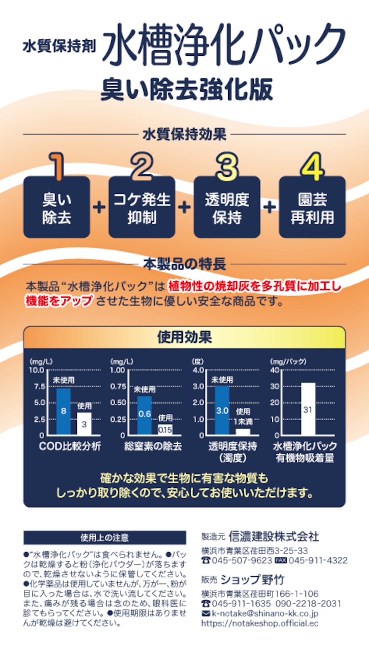 「臭い防止強化版 水槽浄化パック」が、あなたのアクアリウムを快適で清潔に保ちます。ぜひお試しください。